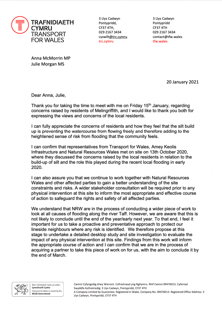 The significant build-up of silt under the railway arches may have contributed to the flooding in February. We have been calling for urgent works to be undertaken and for the silt-build up to be removed. We met with the Head of Transport for Wales who has responsibility for maintaining the arches and we are pleased they have now commissioned a site investigation and study to evaluate the impact of silt build-up and risks of any interventions at this site for e.g. on environment and ecology. TfW has committed to carrying out these works if the study demonstrates removing the silt will be beneficial, even if that benefit is only marginal. In our meeting we were advised the study is expected to be completed by the end of February. TfW has also committed to working collaboratively with NRW to resolve this as swiftly as possible for residents.